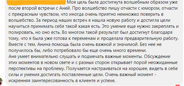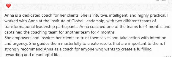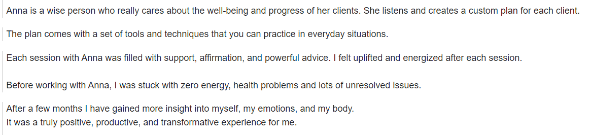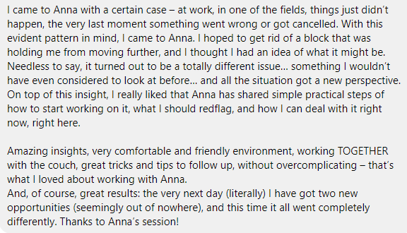 Anna is a wonderful coach who, through her professionalism and deep care about others, helps to untangle difficult life situations. She helped me tremendously. At the end of our work, I changed my life for the better, and I am super proud of myself and grateful to Anna! Last but not least, it was fun to work as a group with other participants!